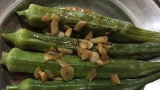 Steam Lady Finger Recipe : Deep South Dish Steamed Okra : Pour oil into a wok and add garlic and fry till golden brown.